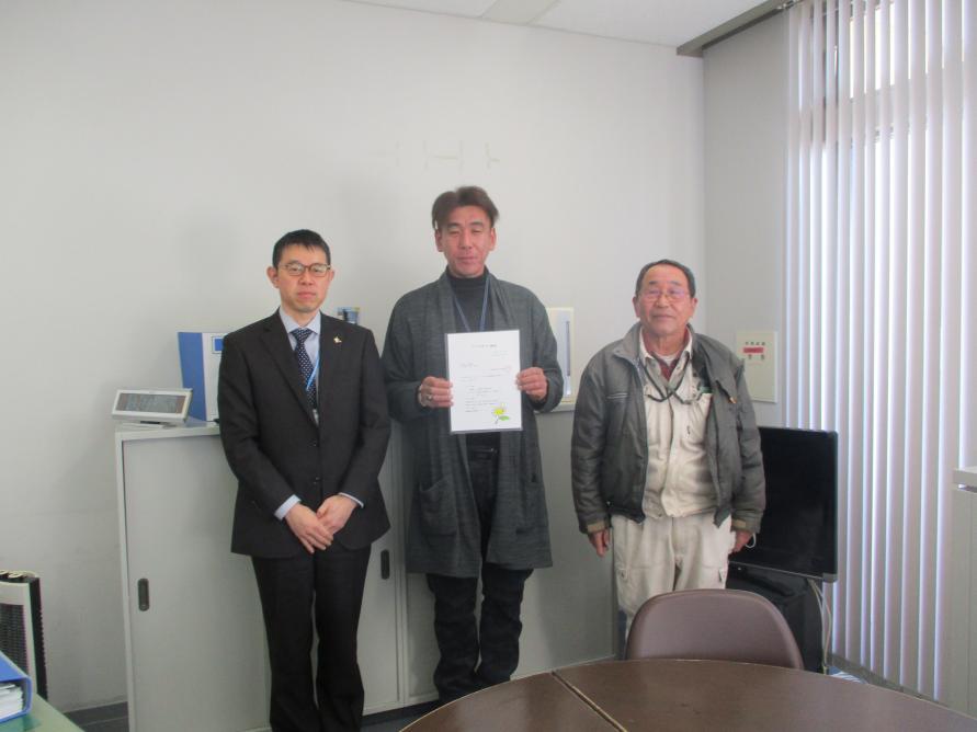 左から 北部土木事務所 山田所長, 株式会社大崎緑化 代表取締役 菊地様, 工事部長 鈴木様