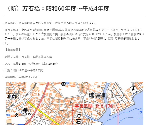 万石橋は、万石浦の湾口を跨ぐ橋梁で、牡鹿半島への入り口となります。旧万石橋は、それまでの渡船に代わり・・・
