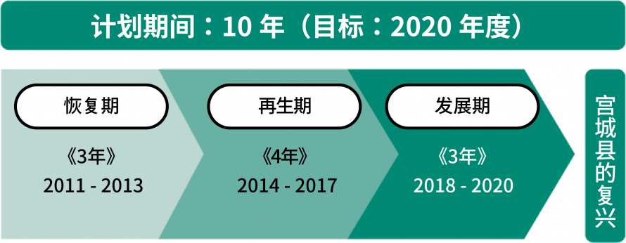 到实现复兴的期间一般定为10年,以2020年为复兴目标,将其计划期间分为3期,分别是以支援受灾者为中心,恢复生活基础设施和公共设施的“恢复期”;不仅要支援直接受灾者,还要进一步加强对由于震灾影响给生活和事业带来障碍者的支援、充实生活基础设施等来实现本县再生的“再生期”;以及采取战略性措施推动宫崎县行政发展的"发展期"。