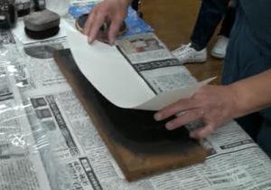 事前に新聞紙を湿らせ、摺った版画を置くための床を用意する。