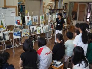 時間いっぱいまで描き、ほぼ完成に近づけた作品や、もう少しの作品も全て並べ、各人の問題意識をもとに対話形式で講評を進めた。同じ制作方法で描いた作品でもそれぞれの持ち味が発揮され、個性あふれる作品となった。各作品の良い点を特に認め、参加者の以後の制作に生かせるようアドバイスし、終了した。
