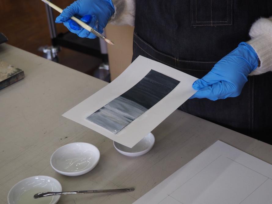 途中、顔料の機能性の分類である有色顔料と体質顔料の違いを、胡粉、膠水、乾性油を用いて体験した。胡粉を2つの絵皿に出し、それぞれ膠水、乾性油と合わせて黒い紙に塗ると、膠水の方は白く発色するが、油の方はほとんど透明になった。同じ白い顔料でも、展色剤との組み合わせで発色が変わり、透明になると体質顔料として絵具の色や粘り気の調整に使われる。