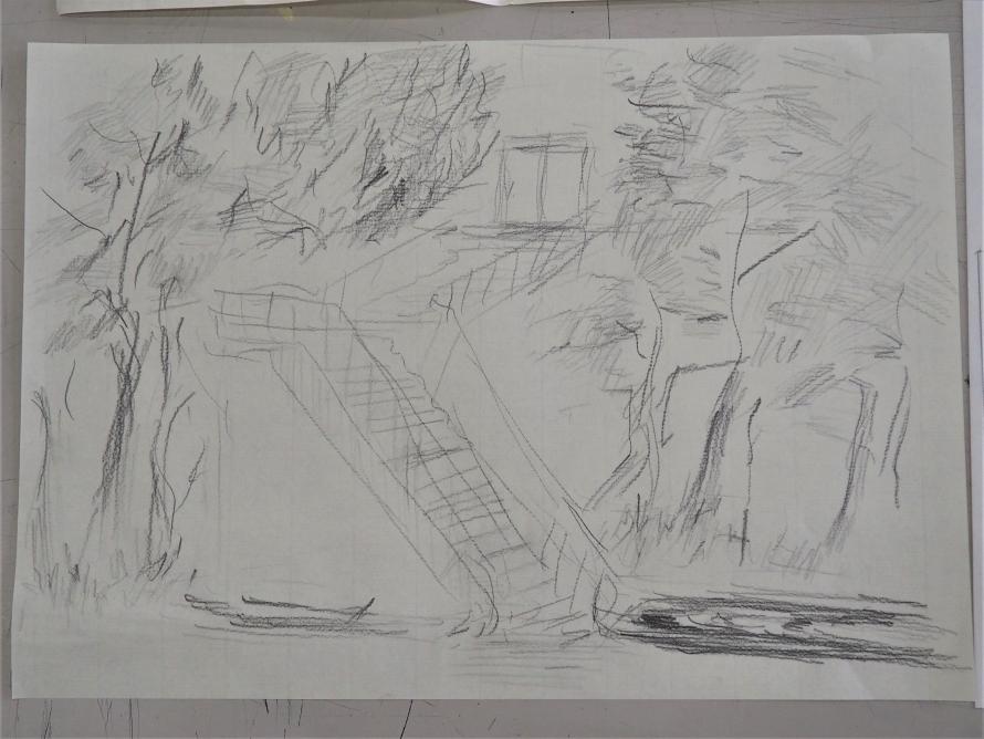 想像で2枚描いたあと、3つ目の制作で、今度は現場に行って描くことにした。正午まで、画板を携え、敷地内を歩き、外観で気になるところを1、2枚描く。記念館の入口の庇や、中庭の柱の根元など、想像で描いたときとは違う場所に目をつけた人も多かった。各自、杉戸さんと話しながら描き進めた。