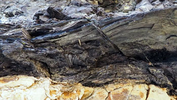 一方、地質学者がこれを見るときは、この崖が何からできており、どのような原因できたのかに注目します。それを観察することで、背景にある地球の営みが分かるためです。近づいてみると、この崖は下から上まで水平の縞模様があることがわかりますが、この模様はクールベとモネの絵にはあまり詳細には描かれません。更に近づいて見てみると、それが白い岩石と黒い岩石の交互に積み重なったものであることがわかります。白いものはチョーク(石灰岩)と呼び、海の中の植物性プランクトンの殻が長い時間をかけて積もったことで固結したものです。一方、黒いものはよく見ると礫状のものが並んでいるもので、これをフリントノジュールと呼び、水晶と同じ二酸化ケイ素が集まってできたモノ、だそうです。二酸化ケイ素は火山灰や溶岩に多く含まれるので、これは火山活動が活発なときにできたものだと考えられるということでした。このようにして、地質学者は崖を見つめ、最後にはこの崖を通して8000万年前の海底の様子を推測するのだ、と話しました。
