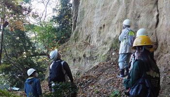 次に、牛越橋の南東に位置する露頭に向かいました。この場所は高い崖の下となっているため、万が一に備えて全員ヘルメットを装着して移動しました。この崖の下は、砂や枯葉の積もったやや急な斜面となっていて、歩くのに苦労している参加者もいました。そのため、柱状図のスケッチなどは行わないこととし、実際に目の前にある地層を良く観察することに注力しました。この2地点目では、実際に地質学者がフィールドワークを行う際の振舞いを身体的にも体験することとなりました。