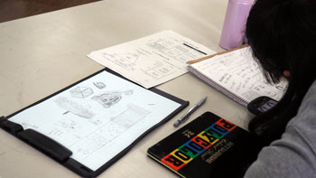 午後からは、今回の活動を通じてイメージしたことやインスピレーションのあったことを紙に表してみる時間としました。講師と話をする中では、自然科学的な論理性に基づいて推測した過去の風景が多く出てきましたが、それだけでなく、この活動中には様々な発見があり、普段は歩かない崖下を歩いてみたり、膨大な過去の時間に向き合ったりといった印象的な体験も多くありました。このような経験に基づいて、自分なりに想像したイメージや思いついたことのアイデアスケッチを紙に描いてみることとしました。
