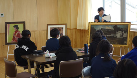 当館が所蔵する高橋由一《宮城県庁門前図》、萬鉄五郎《風景・春》、安井曾太郎《少女像》の作品のレプリカを見て、それぞれが描かれた年代を推測し、古い順番に並べるという活動を行いました。年代を推測するには、レプリカをじっくり見て、それぞれの作品の特徴を探る必要があります。生徒は班ごとに分かれ、目の前のレプリカを観察したり、3作品を手のひらサイズに印刷したカードを見比べたりしながら、気付いたことやそこから考えたことについて話し合いました。各班に並べた順番とその理由を尋ねると、建築や構造物、服装など、描かれているモノから古い順番を推測した班があった一方で、ストロークの荒さや図像の不明瞭さなど、絵の描き方から順番を推測した班もあり、多様な見方や考え方を共有しました。どの班も自分たちの言葉で順番と推測した理由を説明し、絵をよく観察して、また話合いも十分に行ったことを示していました。