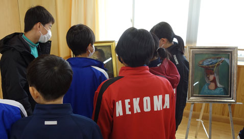 最後に、2つの活動を踏まえ、「鑑賞」ではただ漫然と見るだけでなく、意識的にポイントに注目して、感じたことから様々なことを考えて見ることも大切であると伝えました。生徒の感想には、「描かれている物の内容や使われたであろう物から描かれた年代を考える事が楽しかった」「年代のうつり変わりの中で絵の内容が変わっていっていることを考えながら観ることができた」「明度、彩度など決められた視点から見て、深く考えることも楽しいけど、自分の感じ通った作品の違いを話して『そんな見方があるか』と驚くことも一つの楽しみ方だと気付けた」「班のみんなと、絵画の描かれた順番を話し合って考え、自分とは違う、様々な角度から観た感想などを知ることができ、考えられて良かった」などの記述がありました。