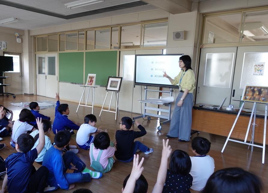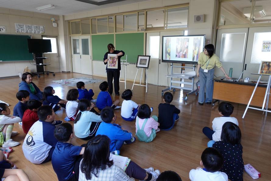 続いて、ドイツ表現主義の画家パウル・クレーについて取り上げ、その芸術観や作品を紹介し、レプリカやスライドを用いて当館所蔵の3作品を鑑賞しました。《緑の中庭》の絵の具の搔落としや、《橋の傍らの三軒の家》の柔らかな色彩と幾何学図形の組み合わせ、《アフロディテの解剖学》の大胆な切断や結合など、それぞれの作品に見られる実験的な表現に児童たちは興味津々の様子でした。児童たちに感じたことを自由に言葉にしてもらうと、「塗った所を削ったの?」「にじんだ色が綺麗!」「上手く描けたのに切っちゃうの?」等、驚きの声が聞かれました。