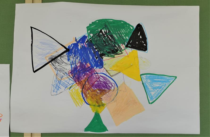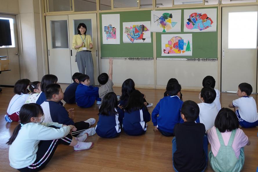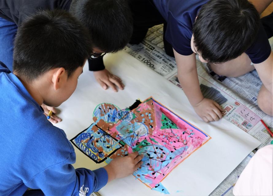 最後に、出来上がった作品を展示して全員で鑑賞しました。児童たちは「壁に貼るとまた違って見えるね」と感心したり、他のグループの作品を見て「魚に見えてきた!右が口で、左が尾ひれだよ」「あの絵は人が手を広げて、片足で立ってるみたいに見える」と言って自分たちも同じポーズをとってみたりと、感想が尽きませんでした。