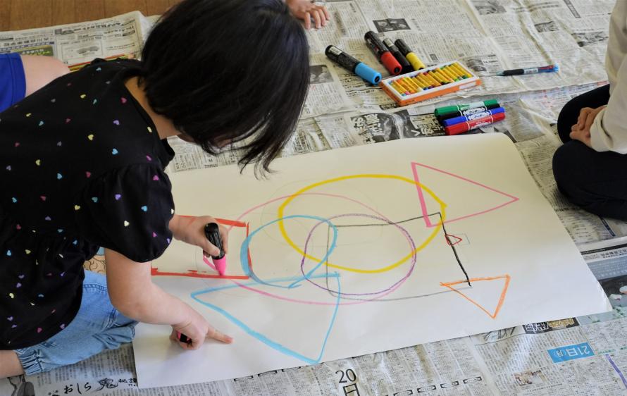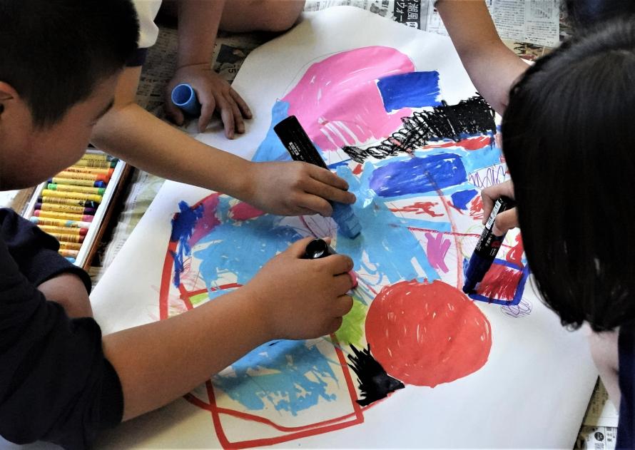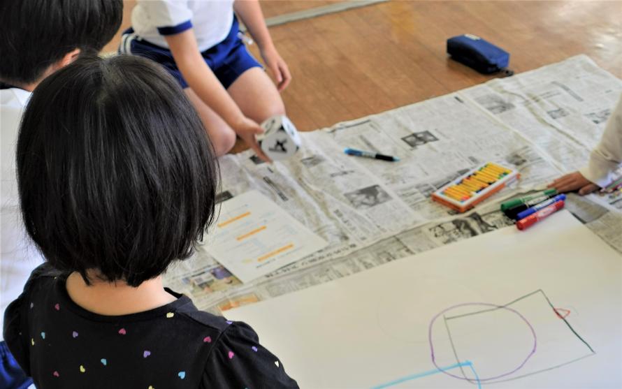児童たちは、サイコロを振り、出た目に応じて使える画材と描く形が決まるというちょっと変わった描き方で、順番に形と色を重ねていきます。