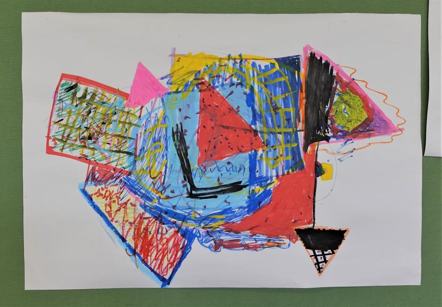 普段、何か具体的なものや風景を思い浮かべ「これを描こう」と思って描画することが多い児童たちにとって、自分の意志とは関係なく描く対象や使う画材が決まっていくというルールは、とても新鮮だったようです。いつもなら混ぜようと思わない色や線が交わり、別々の児童が描いた図形が組み合わさって、不思議な形が生まれていきます。活動が進むにつれ、「この線かっこいいね!」「新しい色が生まれそう」「この形、宇宙人に見えてきた!」と会話も弾み、色とりどりの画面の様子も、自分とは異なる表現への向き合い方も、豊かに変化していきました。