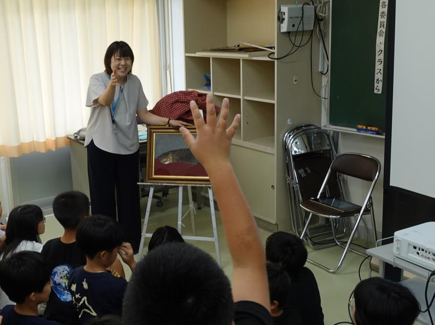 次に、布で隠した作品の前に児童を集め、どんな猫が描かれているかを想像してもらい、その後、長谷川潾二郎《猫》を紹介しました。作品を見て気付いたことや、想像したことを自由に発言してもらいながら、対話を交えてじっくり鑑賞しました。「どんな気持ちで描いたかな」という問いかけをすることで作者が愛猫を描いた思いにも着目してもらいました。児童からは「家に猫がいて、猫が可愛かったから描いた」「家で大事に飼っていた猫を描いた」など作品から感じたことや自分の経験をもとに発言していました。