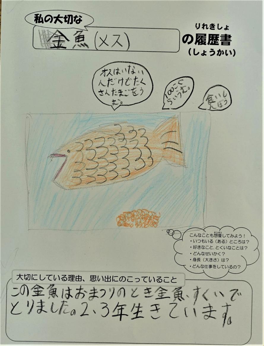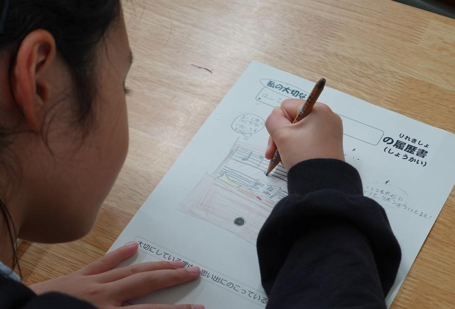 続いて、作者が作成した「タローの履歴書」を紹介し、児童に自分が飼っている生き物や、大事にしている物など、「自分にとって大切な物の履歴書」を作成してもらいました。