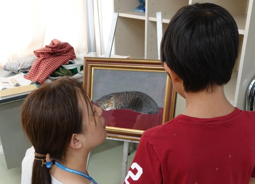 ちを込めて描いていました。履歴書作成中も、作品を近くに見に来て、キャンバスの布目に気付いたり、質問をしながらじっくり鑑賞している児童もいました。