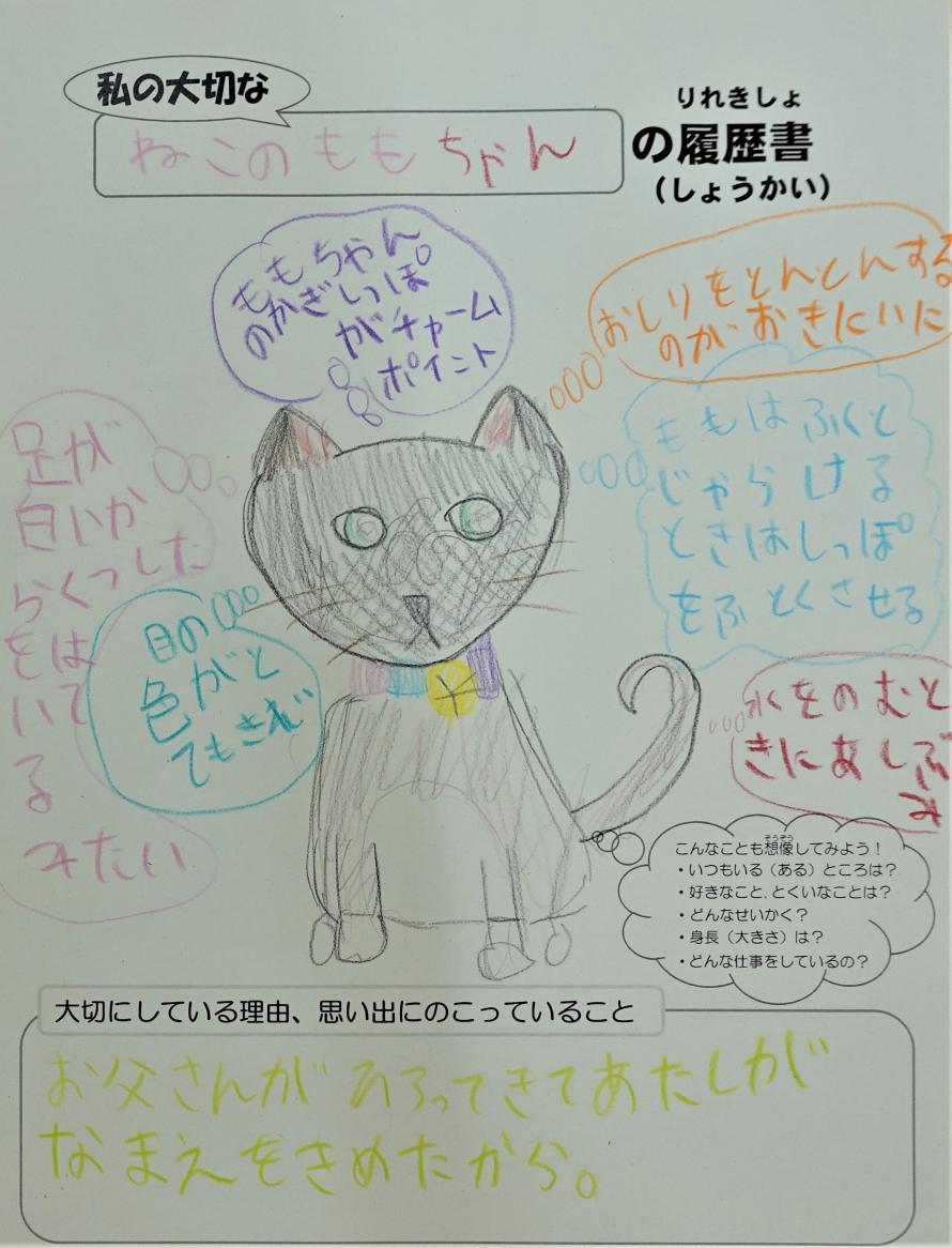 昨年度までは、自分で想像したオリジナルの「ネコの履歴書」の作成に取り組んできましたが、今年度はオリジナルの「ネコの履歴書」作成に取り組んだ学校と、視点を変えて「自分の大切な物の履歴書」作成に取り組んだ学校があり、プログラムに広がりを持たせました。