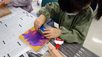 カルタの完成後は、再び展示ホールへ移動してカルタ大会を行いました。ルールが分からず、自分の読み札の前にずっと陣取っている子どももいましたが、少しずつ理解し、見付けた絵札に我先にと駆け寄り自分のものにして喜ぶ姿が見られました。