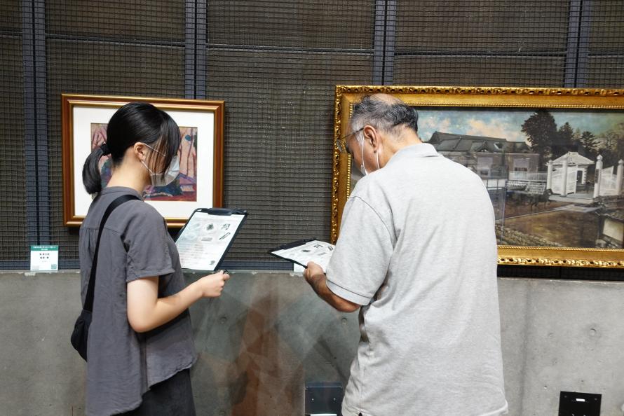 レプリカの一部をクローズアップした画像と、ヒントとなる作者名、作品名をクロスワードパズルの要領で解答してもらいました。参加者は、クイズシートを片手に問題を解きながらじっくりと鑑賞していました。角田会場ではグループで参加する方も多く、クイズシートをきっかけに会話が盛り上がり、作品の見方や感想を互いに共有している様子も見られました。