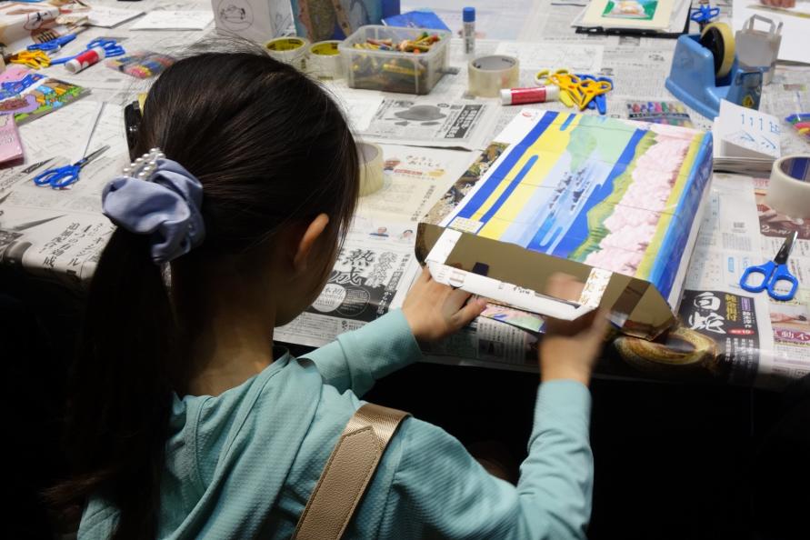 ポスターを使用し、ミニノートやバッグの制作を行いました。たくさんのポスターの中からどの色や柄のポスターを使うか悩みながら選ぶ方が多く見られました。バッグの制作では、大きさや柄の見え方について試行錯誤しながら、じっくりと制作に取り組んでいました。完成したバッグに「レプリカ・クローズアップ・クイズ」のクイズシートや、「まねっこお絵かき」で作成した絵を入れて持ち帰ったり、バッグを互いに見せ合い、写真を撮ったりして楽しんでいました。