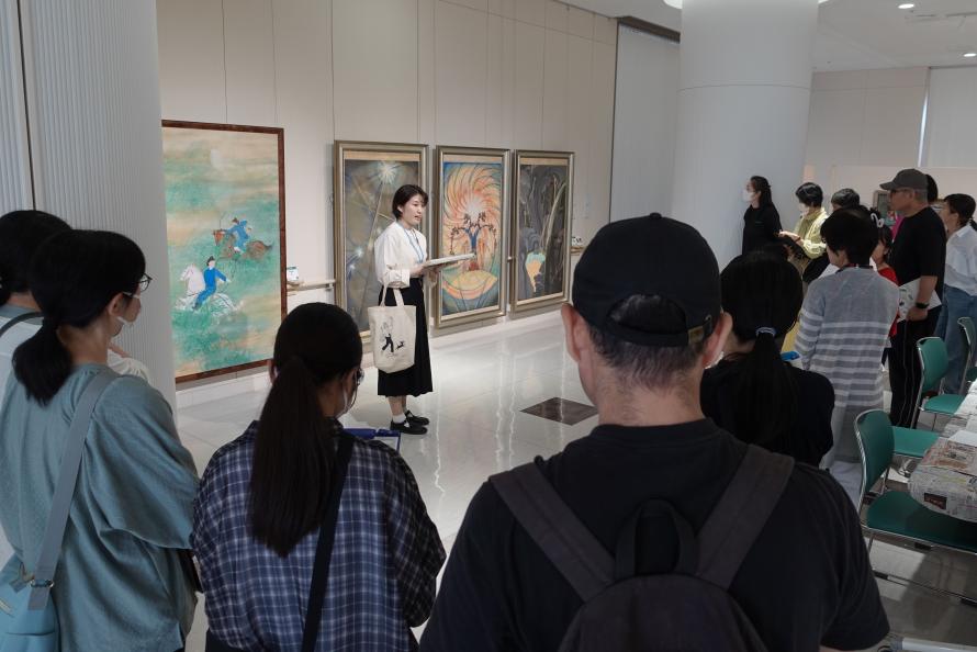 学芸員が展示を前にしてトークを行いました。宮城県美術館の概要を話したのち、まず高精細レプリカの特徴や作成方法について解説しました。参加者の方には、ライトで光を当ててレプリカに凹凸がないことを確かめてもらいました。次に、高橋由一、尾竹竹坡、カンディンスキーの3名の作家を取り上げて作品解説を行いました。「トークを聞くことで作品への理解が深まった」「リニューアル後の美術館にもぜひ行きたい」といった感想がありました。