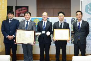 1月31日(金曜日)、第5回全国豆腐品評会での受賞報告のため、ささはら豆腐店店主の笹原淳(ささはらじゅん)氏、兎豆屋店主の安達圭介氏、三倉産業株式会社の浅蜊直(あさりただし)氏、二ツ屋生産組合の秋山広勝氏が遠藤副知事を表敬訪問しました。