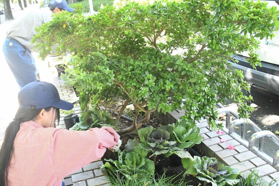 宮城県農業高等学校園芸科2年生の皆さんにご協力いただき、ハボタンなど約900株を植え替えました。