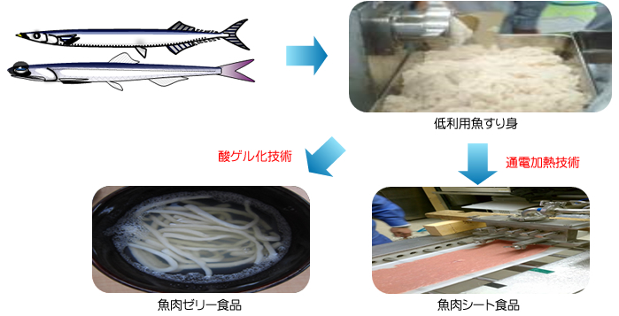 サメなどについて、無晒しすり身製造技術などの新規魚肉すり身製造技術導入を導入して、低利用魚のすり身を製造開発します。 サメのすり身などから、酸ゲル化技術により、新食感を持つ魚肉ゼリー食品を製造開発します。 サメのすり身などから、布ベルト通電加熱技術により、ソーセージ・ジャーキーやスナック菓子などに利用できるシート状の中間素材を製造開発します。