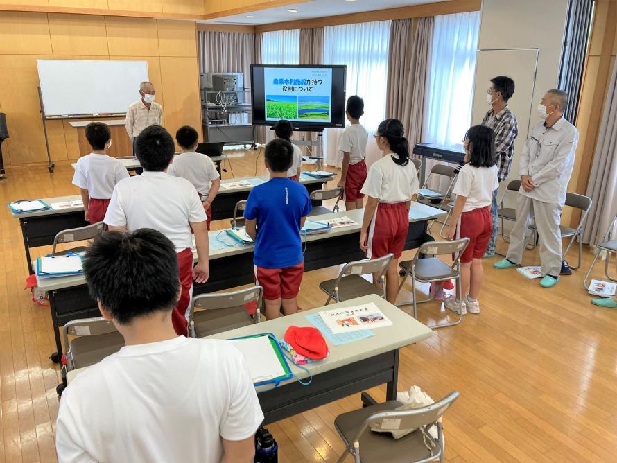 2つ目の講座では,1日に田んぼ1アールで2,000リットルもの水を使用していることや,北村の田の水は旧北上川から和渕揚水機場と前谷地揚水機場を通って田に届き,広渕排水機場を通って定川に流れていくことについて学習しました。