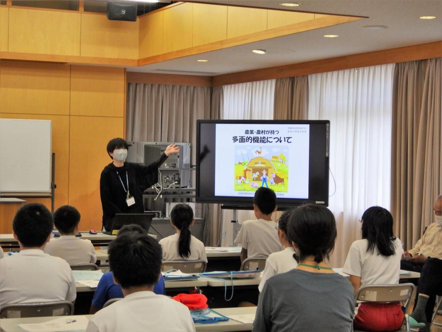 3つ目の講座では,田んぼは作物を作る機能を持つほか,洪水を防ぐ,土砂崩れを防ぐ,生き物を育てるなどの多面的な機能を持っているということを当部より説明しました。