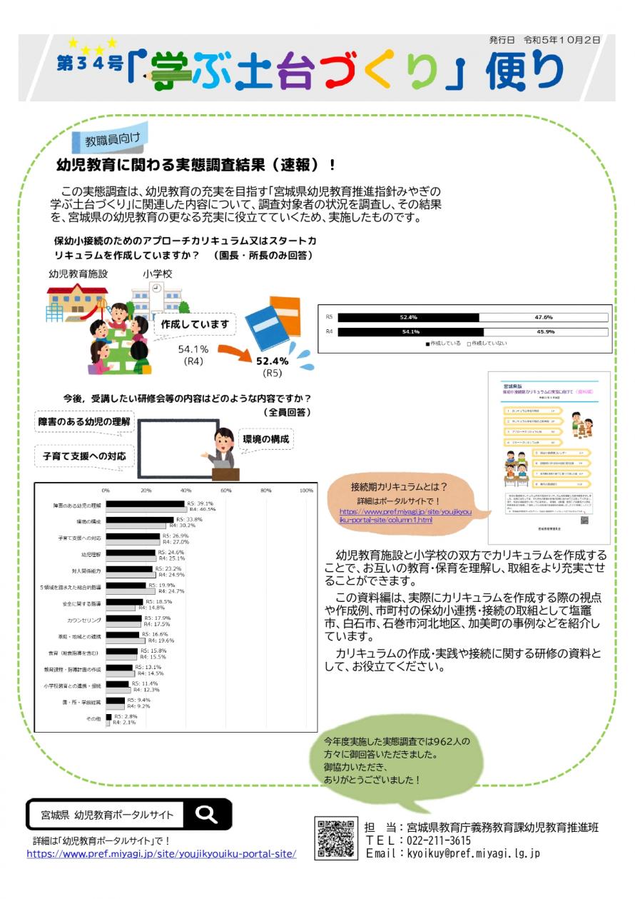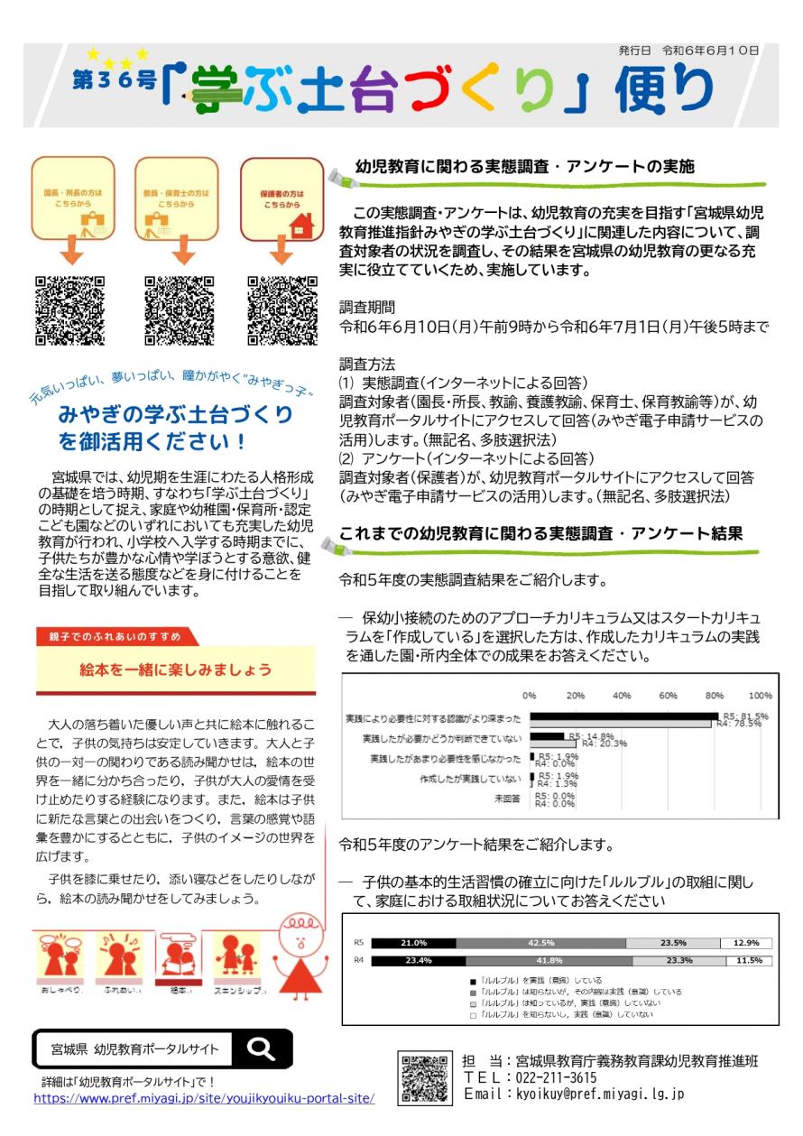 この取組の一つとして、「学ぶ土台づくり」に関する県の取組などを掲載した「学ぶ土台づくり」便りを発行し、幼児教育について情報発信を行っています。