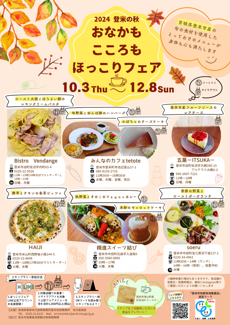 期間中、対象店舗で宮城県登米市産の旬の食材を使用した特別メニューを提供します。対象店舗でフェア特別メニューを含む合計1,000円以上(税込)の飲食1回につき、スタンプを1個獲得!(※テイクアウトも対象です)スタンプを2個集めた方には景品をプレゼントします。(先着50名様)