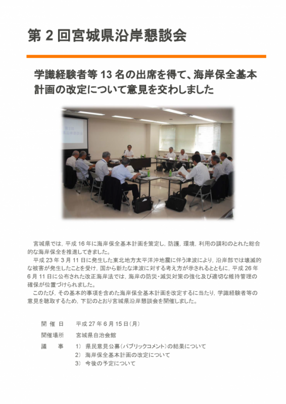 三陸南沿岸海岸保全基本計画及び仙台湾沿岸海岸保全基本計画の改定にあたり、平成27年6月15日月曜日に第2回宮城県沿岸懇談会を開催し、学識経験者等の方々からご意見をいただきました。