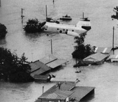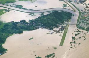 破堤箇所対岸(右岸)上空より、破堤箇所及び浸水状況を望む