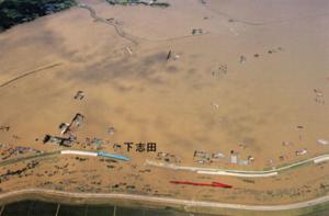 吉田川左岸下志田地内上空より、破堤箇所を望む