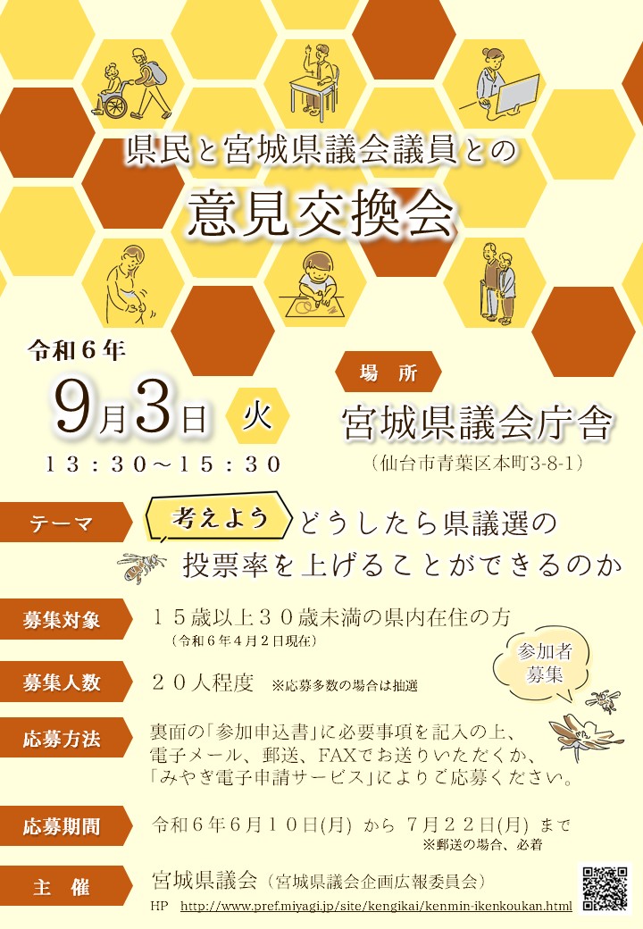 宮城県議会では、県民の皆さんの議会への理解と関心を深め、議会を身近に感じていただくため、下記のとおり「県民と宮城県議会議員との意見交換会」を開催します。