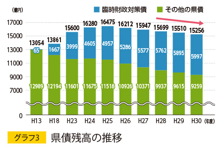 県の借金である県債残高の総額は、5年連続の減少となり、長年にわたる県債の発行抑制効果が現れています。一方、臨時財政対策債※1の残高は年々増加しています。