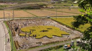 オクトパス君を描いた茶色の稲と黄色の稲は,参加者で協力して刈り取りました。