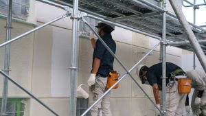 今回塗らない化粧部分の養生を行った後に、目地先行で7色に塗り分けを行いながら中塗りを行いました。足場に当たり、ローラーが上手く転がせない場所も考えながら工夫して作業を行いました。