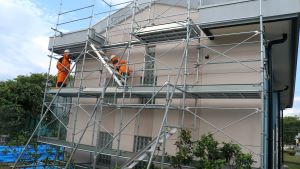 ボイラー室南側の外壁塗替え作業に入ります。全員で協力して足場を組みました。作業前に危険予知を行い、ヘルメットやフルハーネスの着用等、お互いで確認し安全作業に取り組みました。