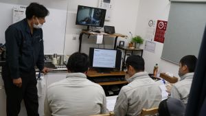 事務所では会社説明と今まで曖昧だった塗料カタログの詳しい見方などを教えて頂きました。施工中の現場は、工場の屋根と外壁の塗替えでした。自分たちの作業スピードとは全然違うプロの作業スピードと仕上がりの綺麗さに感激し、自分たちもその技術に近付けるよう今後の訓練に励みたいと意気込んでいました。