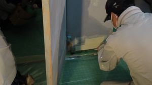 初めの作業として墨出しと養生作業です。長さと幅を割り出し、チョークラインで真っ直ぐに線を引きガムテープで塗料が漏れ出さないように注意を払いながら作業を行いました。