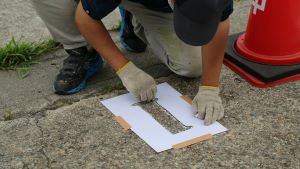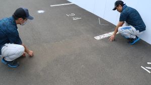 昨日駐車枠を養生した箇所にローラーでラインを引きました。コンクリート面は吸い込みがあるため、先に吸い込み止めをする必要があります。使用する分量を計測して無駄がないように作業準備を行います。