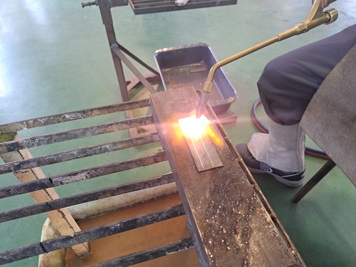 自動車整備工場では、マフラー等を取り外す際、錆びて腐食したボルトを取り外す場面でガス溶接機が大活躍します。便利な機器である反面、正しい知識と取り扱いができなければ火災等の事故に繋がるので、皆真剣に実技講習に取り組みました。