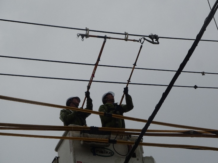 コンクリート電柱の一番高いところに高圧配電線の3本の電線が装着されます。配電線工事では、感電防止のために間接活線工具と呼ばれる黄色い柄の長い工具を使用していました。今日は、現場の概要を目視と図面によって説明を受けた後、先輩の作業を見学しました。高所作業車のバケット内で、二人息を合わせて素早く作業を行っていました。
