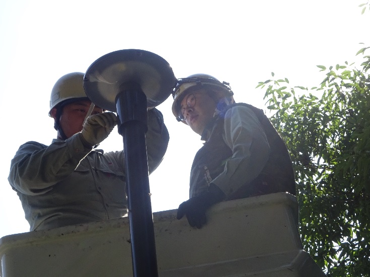 街灯のLED化工事の現場を見学しました。最初に、社長様から現場で概要説明をしていただきました。高所作業車を用いて古い器具を取り外し、また、ポールを短く切断してから新しい照明器具の取り付けを行っていました。昭和の雰囲気から、現代風に様変わりしていました。最後に、小型の高圧受電設備も見学させていただきました。