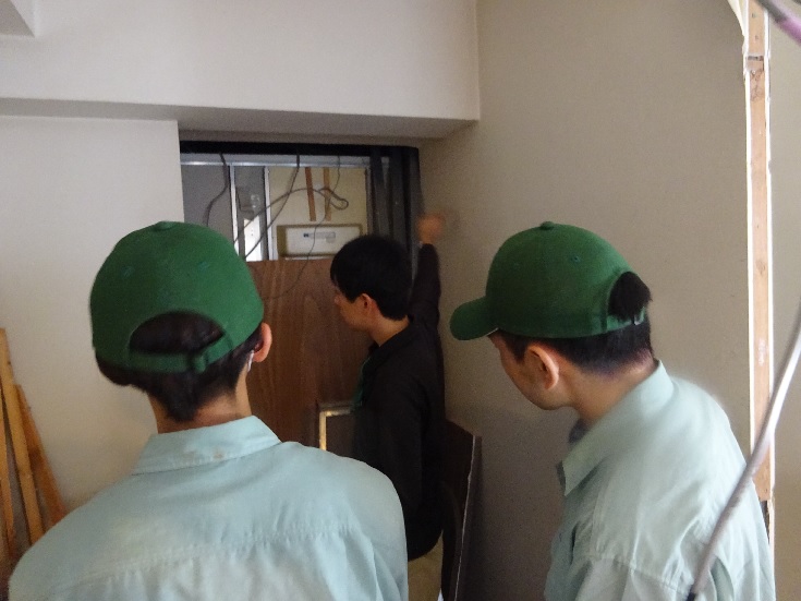 鉄筋コンクリート造りのマンションのリフォームの現場です。先輩から、図面により概要説明を受けてから、キッチン、ユニットバス、洗面所などの交換に伴い、先行して施工された電気配線やダクトなど実物を見学しましました。