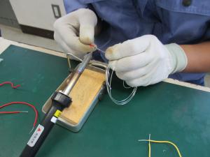 卓上で基本的な回路の製作を行っています。回路を製作したあと,導通試験を行い間違いがないかをチェックします。次に,実際に電源を接続して点灯試験を行います。基本的な回路になるので,ここでしっかりと理解しておかなければなりません。自分で作った回路が上手く動作した時は感動ものです!