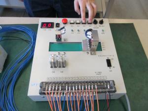 電子制御システム科2年生は,技能検定電気機器組立て(シーケンス制御作業)2級(中級技能者レベル)の合格を目指して訓練をしています。シーケンス制御は,あらかじめ定められた動作順序に従って機器等を制御し,エレベーター,自動販売機,自動ドア,信号機,工場の生産ライン等,多くの分野で活用されています。