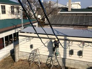 作業内容は大きく分けて二つあります。一つ目は、建物に引き込む電線を柱上にて接続する作業です。