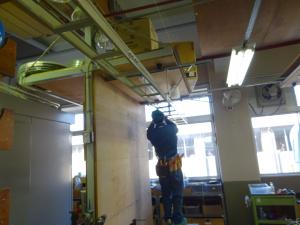 塗装作業は,屋外だけではなく,屋内での作業ももちろんあります。今回は,屋内天井塗装に挑戦しました。校内の廊下天井をローラーと刷毛を使用して塗装しました。屋内塗装で重要なことは,周りを汚さない為の養生です。天井塗装のため,天井に備え付けられている点検口や照明設備、そして壁面を養生してからの塗装となります。脚立足場を使用し,上を見ながらの体勢で学生もはじめは苦戦していました。